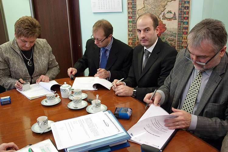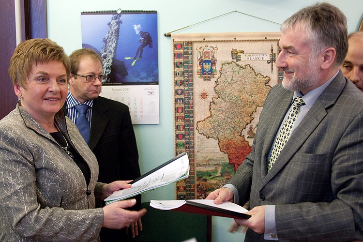 Ze strony inwestora podpisała ją dyrektor naczelna Filharmonii Śląskiej, Grażyna Szymborska – z kontrasygnatą głównej księgowej, Marii Burskiej-Juraczyk, zaś ze strony wykonawców – Konsorcjum firm Mostostal Warszawa S.A. i hiszpańskiej Acciona Infraestructuras S.A. – pełnomocnicy madryckiej firmy, Jorge Calabuig Ferre i Yves Marchand oraz Alojzy Marczak, dyrektor Pionu Rozwoju Regionalnego Regionu Południe Mostostalu Warszawa S.A., lidera konsorcjum. Obecni byli: dyrektor Wydziału Inwestycji Śląskiego Urzędu Marszałkowskiego Grażyna Kamińska i Andrzej Stokłosa, prezes Inwestprojektu Śląsk – inżyniera kontraktu (menedżera projektu).