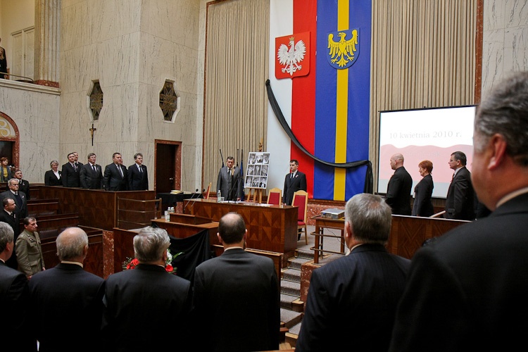 Spotkanie rozpoczęto odśpiewaniem hymnu państwowego oraz symbolicznymi dwiema minutami ciszy. Przewodniczący Sejmiku Michał Czarski zwrócił się do zebranych słowami: „Spotykamy się dzisiaj, aby uczcić pamięć ofiar katastrofy pod Smoleńskiem. To niesamowita tragedia, w której rozmiar trudno uwierzyć. To ogromna strata dla nas wszystkich. Zginęła elita - w miejscu, w którym mieli oddać hołd pomordowanym przez NKWD naszym przodkom."