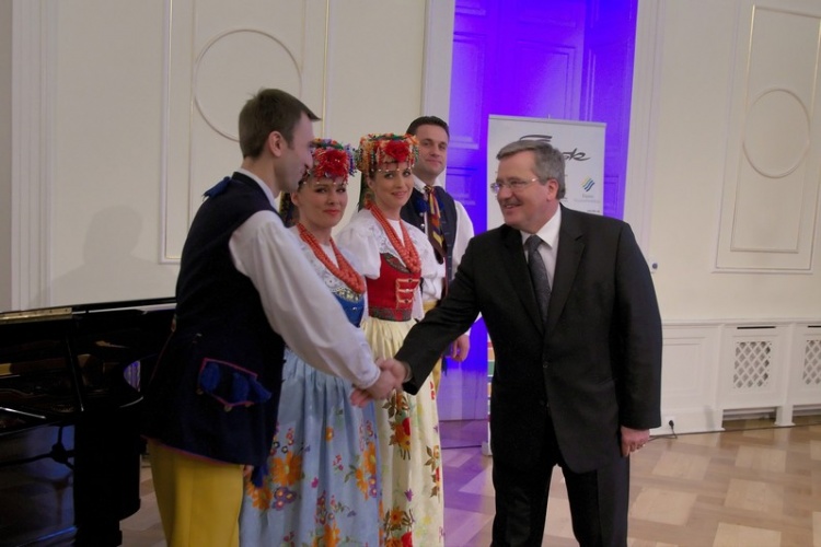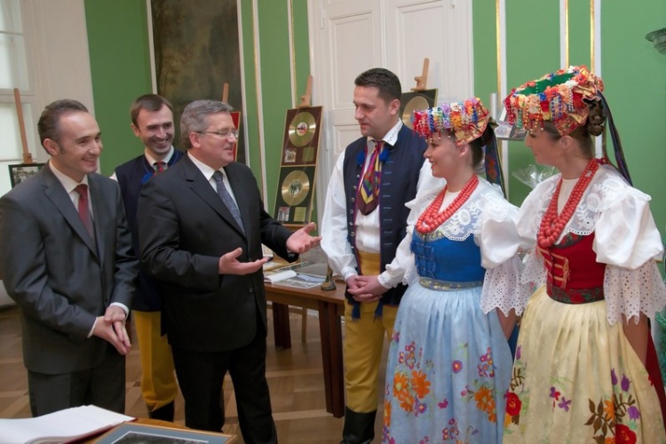 Bronisław Komorowski zwiedził ekspozycję prezentującą historię i dorobek Zespołu oraz wpisał się w księdze pamiątkowej. Wysłuchał także występu artystów "Śląska".
