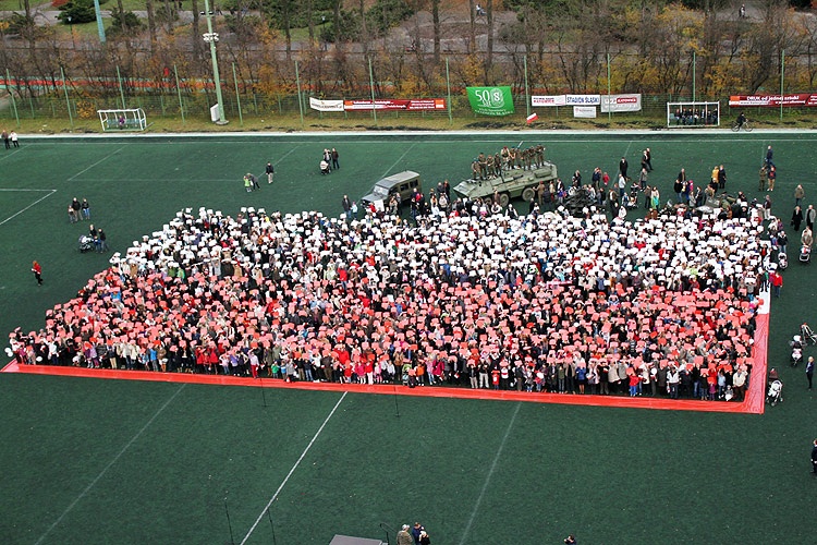 Punktem kulminacyjnym imprezy było odśpiewanie, punktualnie o godz. 15.00 przez blisko 2 tysiące osób, Mazurka Dąbrowskiego przy akompaniamencie Górniczej Orkiestry Dętej „Piekary-Julian". Podczas hymnu wspierała wszystkich śpiewaczka Alina Trefon. Następnie na środku boiska utworzono „żywą" biało-czerwoną flagę. Dla upamiętnienia tych chwil zostały zrobione zdjęcia z kilkudziesięciometrowej wysokości. Będą z pewnością świetną pamiątką dla uczestników imprezy.