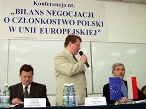 Główny negocjator minister Jan Truszczyński przedstawił skutki akcesji Polski do europejskiej Piętnastki skupiając się na korzyściach jakie odniosą polscy przedsiębiorcy po 1 maja 2004 roku.