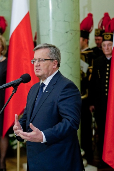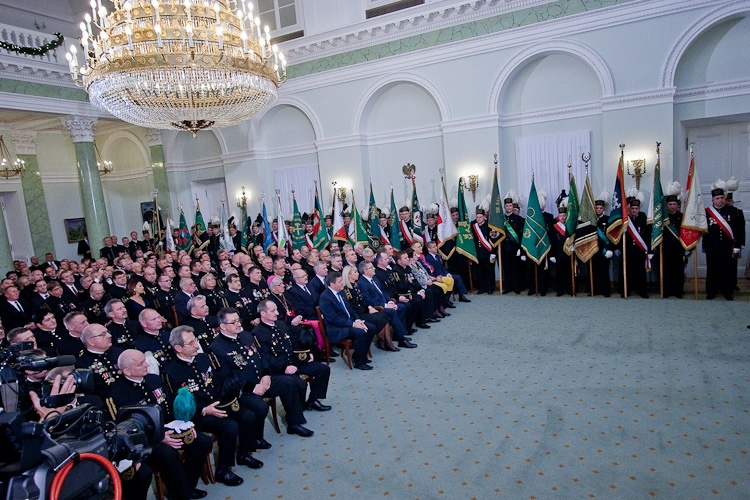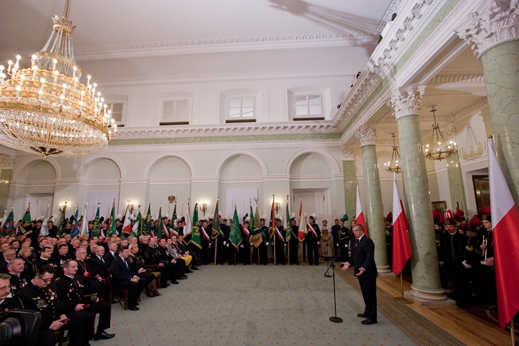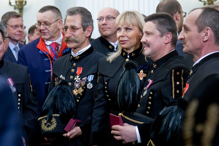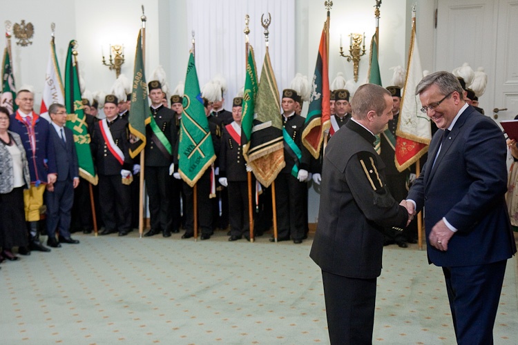 "Jest mi niesłychanie miło, że mogę dziś w Pałacu Prezydenckim gościć górniczy stan, że mogę wyróżnić, podziękować w imieniu całej Polski za trud górniczy, za efekty pracy górników, za cechy charakteru, które najlepiej widać, gdy trzeba prowadzić trudne akcje ratownicze" - powiedział Prezydent RP Bronisław Komorowski wręczając z okazji Dnia Górnika odznaczenia państwowe. Dziękował w imieniu całej Polski za trud górniczy, za efekty pracy górników, za cechy charakteru. "Dziękując, w sposób szczególny myślę o Śląsku, który zawsze będzie się kojarzył z najtrudniejszą, czasem najbardziej ryzykowną, ale też najbardziej zakorzenioną w tradycjach pracą górniczą. Cieszę się i dziękuję, że możemy dzisiaj w Warszawie pokazać, że jest tego Śląska trochę więcej, że Śląsk jest ważny nie tylko dla Śląska, ale dla całej Polski"- dodał. Prezydent zwrócił uwagę, że specyfiką Śląska jest szczególny stosunek do pracy, do poczucia odpowiedzialności za drugiego, za kolegę w pracy, szczególny stosunek do tradycji, do wiary przodków, do języka, przywiązanie do rodziny. "Chciałbym bardzo, aby te cechy - pracowitość, pragmatyzm, praktyczność w podejściu do życia wydobyć i pokazać całej Polsce w jak najlepszym świetle" - powiedział.