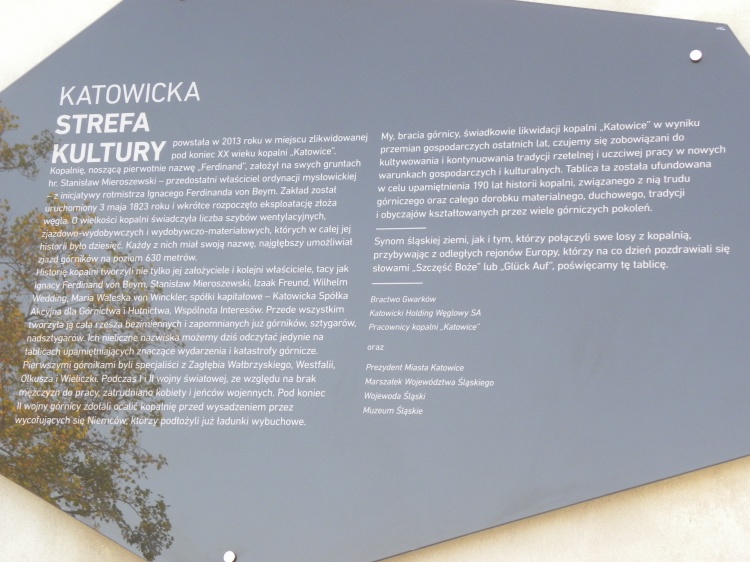 „My, bracia górnicy, świadkowie likwidacji kopalni ”Katowice” w wyniku przemian gospodarczych ostatnich lat, czujemy się zobowiązani do kultywowania i kontynuowania tradycji rzetelnej i uczciwej pracy w nowych warunkach gospodarczych i kulturalnych. Tablica ta została ufundowana w celu upamiętnienia 190 lat historii kopani, związanego z nią trudu górniczego oraz całego dorobku materialnego, duchowego, tradycji i obyczajów kształtowanych przez wiele górniczych pokoleń” – czytamy na tablicy wmurowanej w podstawę wieży wyciągowej „Warszawa” na terenie nowego Muzeum Śląskiego.