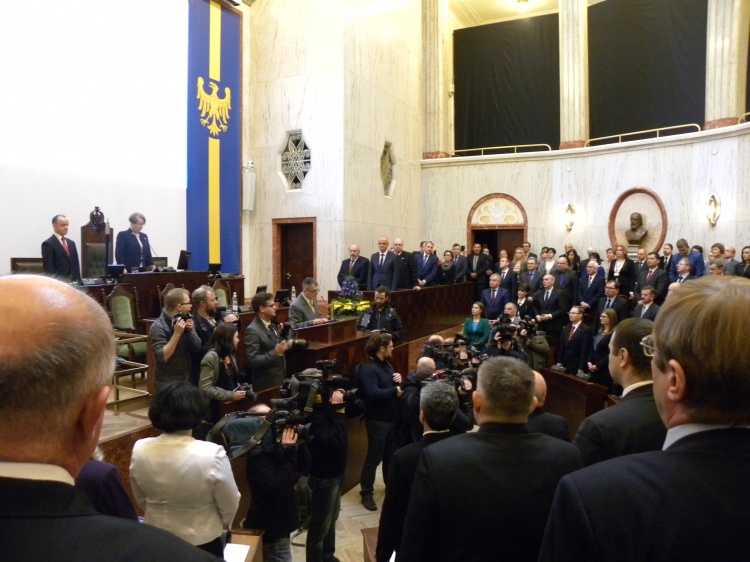 Obrady otworzyła radna senior Maria Potępa. I sesja Sejmiku Śląskiego V Kadencji rozpoczęła się od Hymnu RP. Następnie Andrzej Czaputa SSO Przewodniczący Wojewódzkiej Komisji Wyborczej wręczył zaświadczenia o wyborze na radnego.