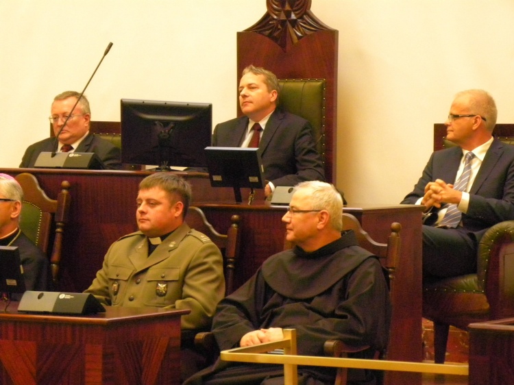 W Sali Sejmu Śląskiego licznie reprezentowani byli członkowie wojewódzkich służb mundurowych. Życzenia świąteczne złożył zebranym Marszałek Województwa Wojciech Saługa.