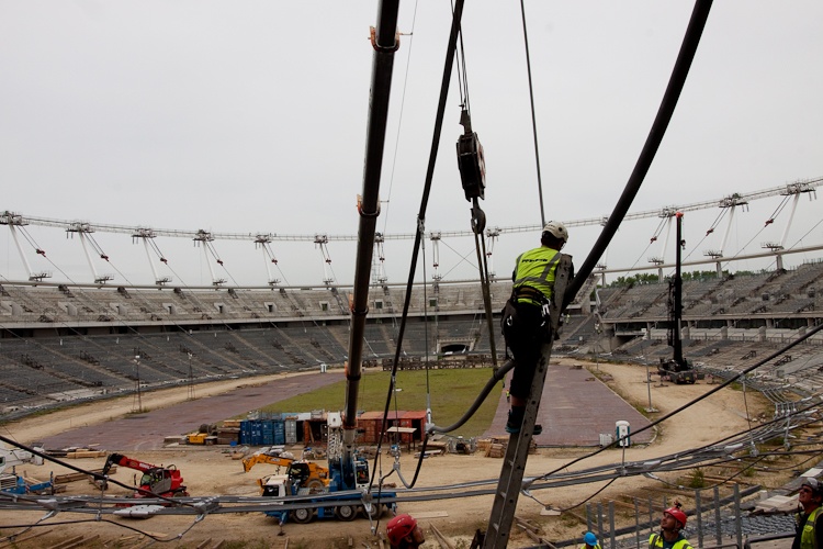 Ta niezwykle skomplikowana operacja trwa nieprzerwanie od czwartku. Podnoszona jest konstrukcja linowa dachu licząca łącznie ok. 11 km długości. Polega to na jednoczesnym podciągnięciu każdej z 40 lin napinających wiązary radialne przy pomocy siłowników, wpięciu do pierścieni ściskanych stadionu na poziomie ok. 50 m oraz lin nośnych na poziomie ok. 30 m.
