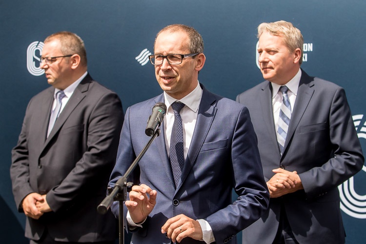 W rozwijaniu pierwszych rolek na modernizowanym obiekcie uczestniczyli przedstawiciele władz regionu – marszałek Wojciech Saługa i członek Zarządu Kazimierz Karolczak oraz prezes Stadionu Śląskiego Krzysztof Klimosz.