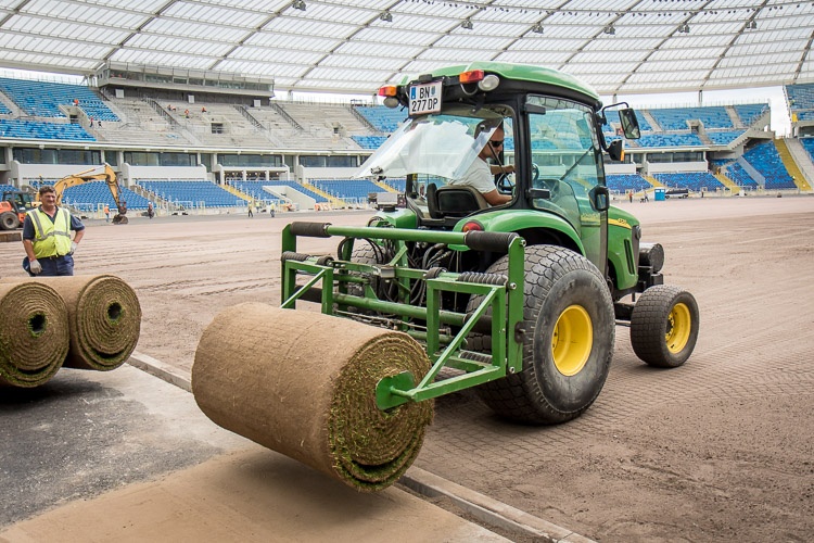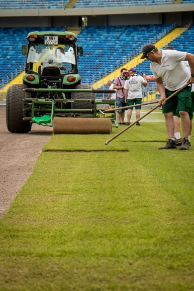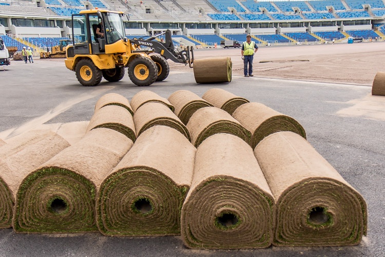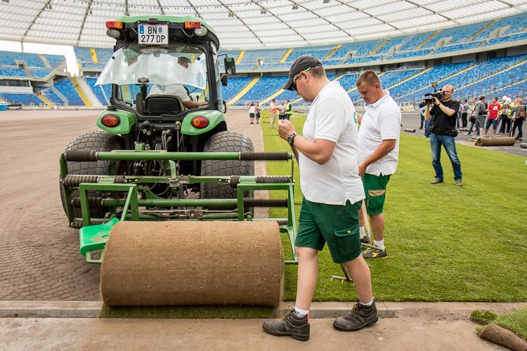 Trawnik sportowy rolowany firmy Pannon Turfgrass Kft. składa się przynajmniej w 90 proc. z wiechliny łąkowej i najwyżej w 10 proc. z żywicy trwałej, przez co jest gęsty i odporny na deptanie. Rolki trawy o grubości 2,5 cm mają 120 cm szerokości i długość od 10 do 12 metrów i pokryją powierzchnię blisko 7,5 tys. metrów kwadratowych, czyli boiska o wymiarach 105x68 metrów. Trawnik tego rodzaju został zainstalowany m.in. na EURO 2008 na stadionach w Innsbrucku i Klagenfurcie, a w naszym kraju na EURO 2012 we Wrocławiu oraz na stadionach Legii Warszawa, Wisły Kraków i Cracovii. Nad całością procesu układania murawy czuwa ekspert FIFA i UEFA do spraw nawierzchni trawiastych Richard Hayden.