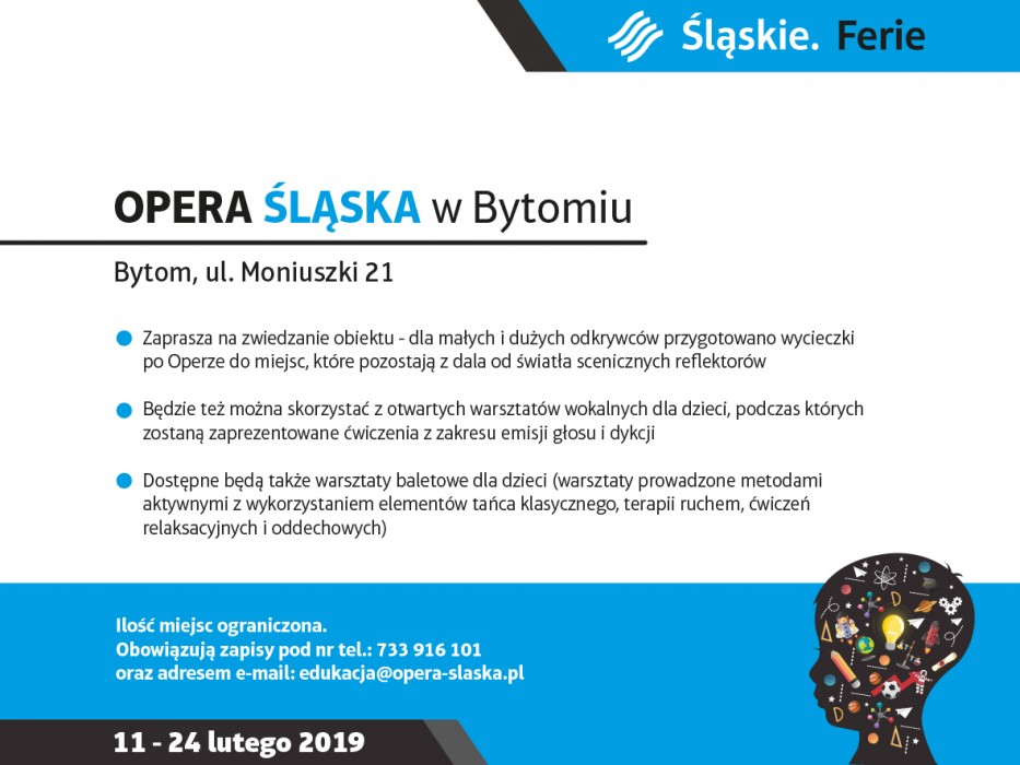 Dzieci i młodzież szkolna z województwa śląskiego w tym roku na ferie czeka dosyć długo. Tym razem rotacyjny termin wyznaczono na ostatnie dwa tygodnie zimowej przerwy od nauki. Instytucje kultury województwa śląskiego zadbają, by czas tych, którzy nie wyjadą poza region, był wypełniony atrakcjami.