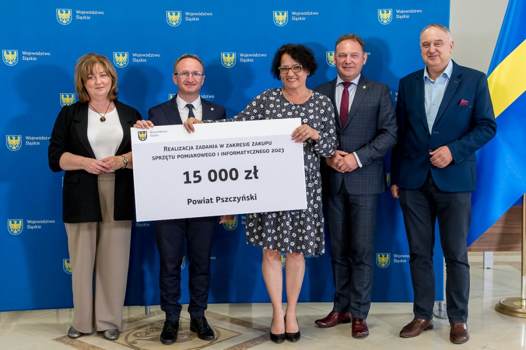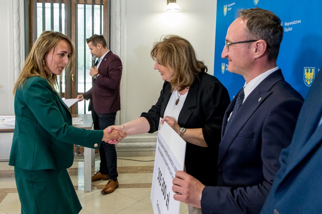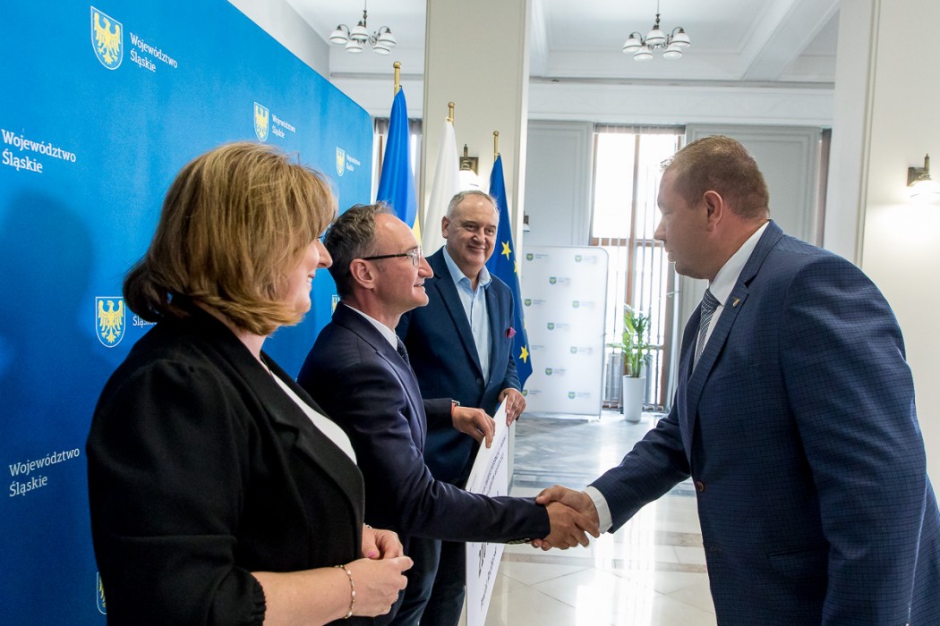 Przedstawiciele samorządów odebrali symboliczne czeki z rąk Grzegorza Boskiego, członka Zarządu Województwa Śląskiego. W wydarzeniu uczestniczyli także radni Sejmiku – Maria Materla i Marek Bieniek.