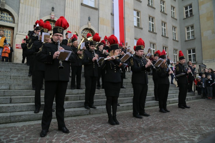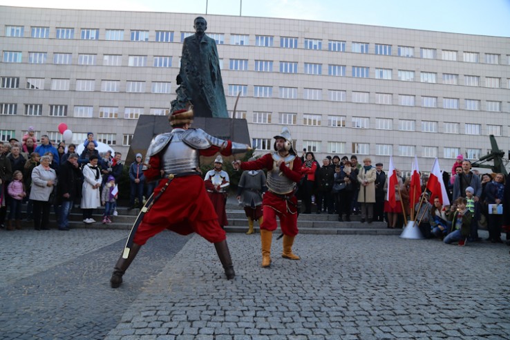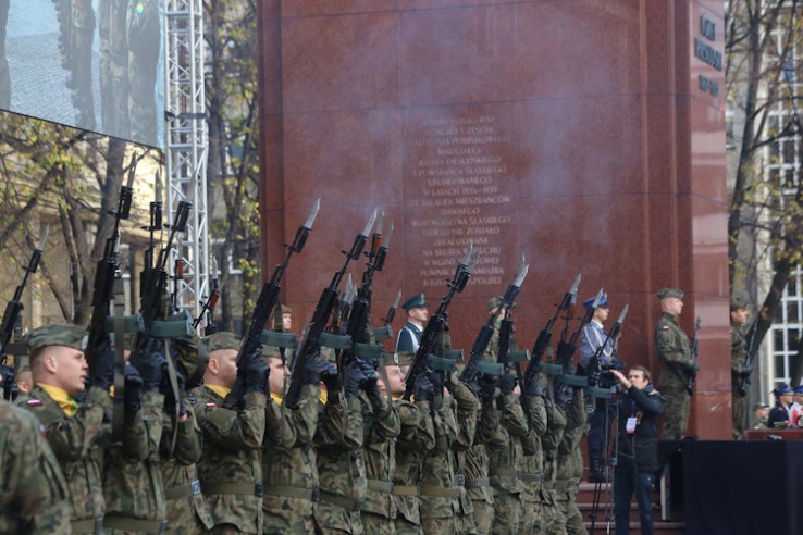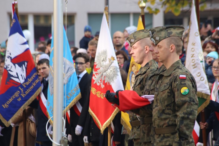 Po mszy św. uroczyście przemaszerowano na plac Bolesława Chrobrego, gdzie przed pomnikiem Józefa Piłsudskiego odbyła się główna część obchodów. W hołdzie bohaterom odegrano hymn państwowy i wciągnięto flagi na maszt. Po przemówieniach odbył się apel pamięci, salwa honorowa. Wieniec pod pomnikiem Józefa Piłsudskiego złożył marszałek Województwa Śląskiego Wojciech Saługa. Uroczystości zakończyła defilada.