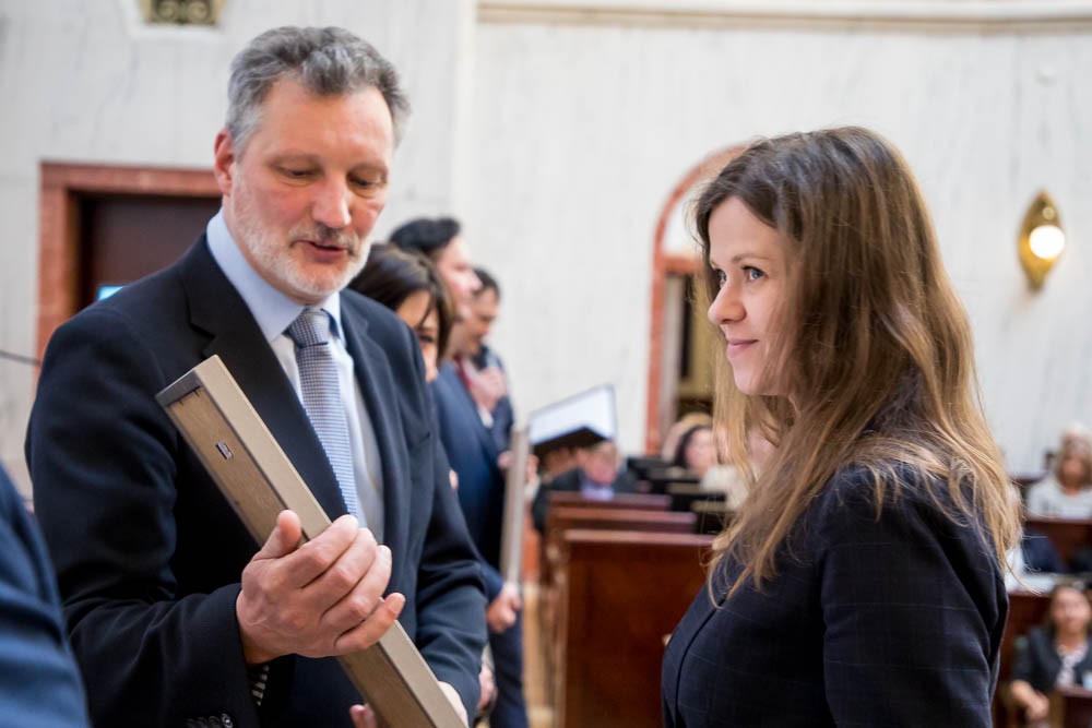 Dyplomy i wyróżnienia uhonorowanym nauczycielom wręczali radni Sejmiku: Maria Materla i Rafał Kandziora.