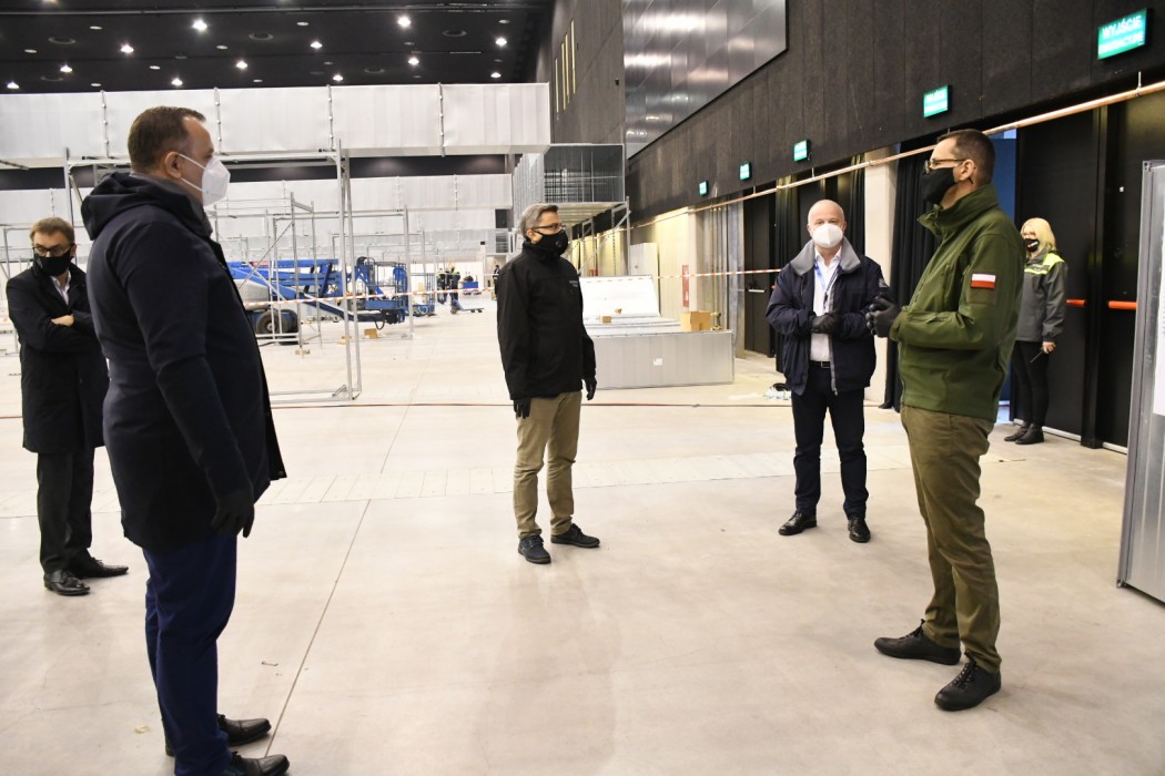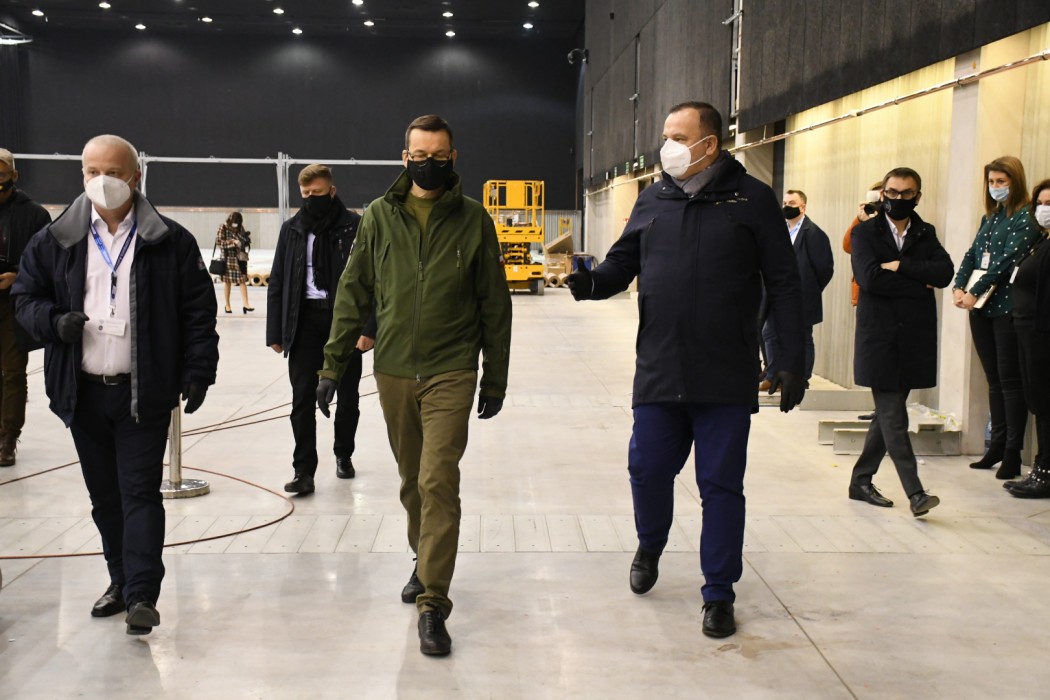 Dziś do MCK przyjechał premier Mateusz Morawiecki. Na miejscu budowy szpitala byli także marszałek województwa Jakub Chełstowski oraz wojewoda Jarosław Wieczorek.