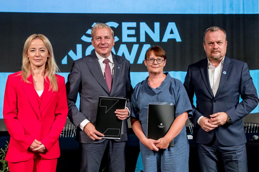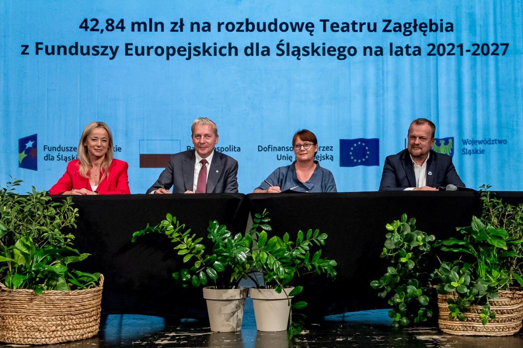 W uroczystym podpisaniu umowy na dofinansowanie rozbudowy teatru uczestniczyli marszałek Wojciech Saługa, prezydent Sosnowca Arkadiusz Chęciński oraz przewodnicząca rady miejskiej w Sosnowcu Anna Jedynak-Rykała i dyrektor Teatru Zagłębia Iwona Woźniak.