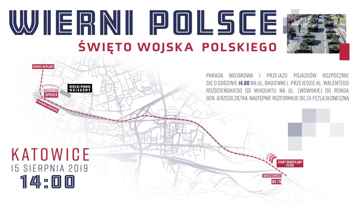 Na ulicach Katowic pojawi się najnowocześniejszy sprzęt, jakim dysponują Siły Zbrojne RP. W defiladzie kołowej przejedzie ponad 190 pojazdów i jednostek sprzętu wojskowego, a w lotniczej zobaczymy 60 statków powietrznych, samolotów i śmigłowców. Defilada rozpocznie się o godz. 14.00 na ulicy Bagiennej w Katowicach, przejedzie al. Roździeńskiego od wiaduktu na Lwowskiej, przez rondo gen. Jerzego Ziętka, aleją W. Korfantego, a następnie rozformuje się na wysokości ronda Pętli Słonecznej.