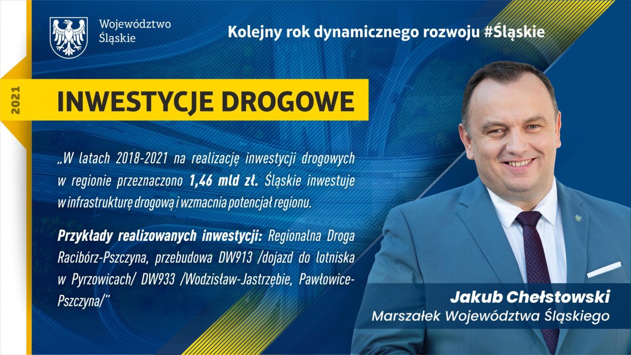 Aż 2,5 mld zł do 2024 roku zostanie wydatkowanych w budżetu Województwa Śląskiego na poprawę infrastruktury drogowej w regionie. W tegorocznym budżecie na zadania drogowe zapisano kwotę około 540 mln zł. Inwestycje realizowane są na bieżąco. Przed kilkoma tygodniami oddano do użytku Drogę Wojewódzką nr 933 na odcinku od DK 78 w Wodzisławiu Śląskim do ronda przed granicą z Jastrzębiem Zdrój. Jeszcze w tym roku otwarty zostanie kolejny odcinek DW 933 z Pawłowic do Pszczyny mierzący 23 km.