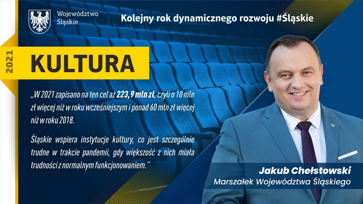 Wydatki na kulturę w budżecie województwa rosną systematycznie z roku na rok. W 2021 zapisano na ten cel aż 223,9 mln zł, czyli o 10 mln zł więcej niż w roku wcześniejszym i ponad 60 mln zł więcej niż w roku 2018. Śląskie wspiera instytucje kultury, co jest szczególnie trudne w trakcie pandemii, gdy większość z nich miała trudności z normalnym funkcjonowaniem. Opera Śląska w Bytomiu zostanie kompleksowo zmodernizowana. Realizacja inwestycji o wartości 56 mln zł odbywa się przy wsparciu Województwa Śląskiego. Zakończenie prac przewidziano na 2023 rok.