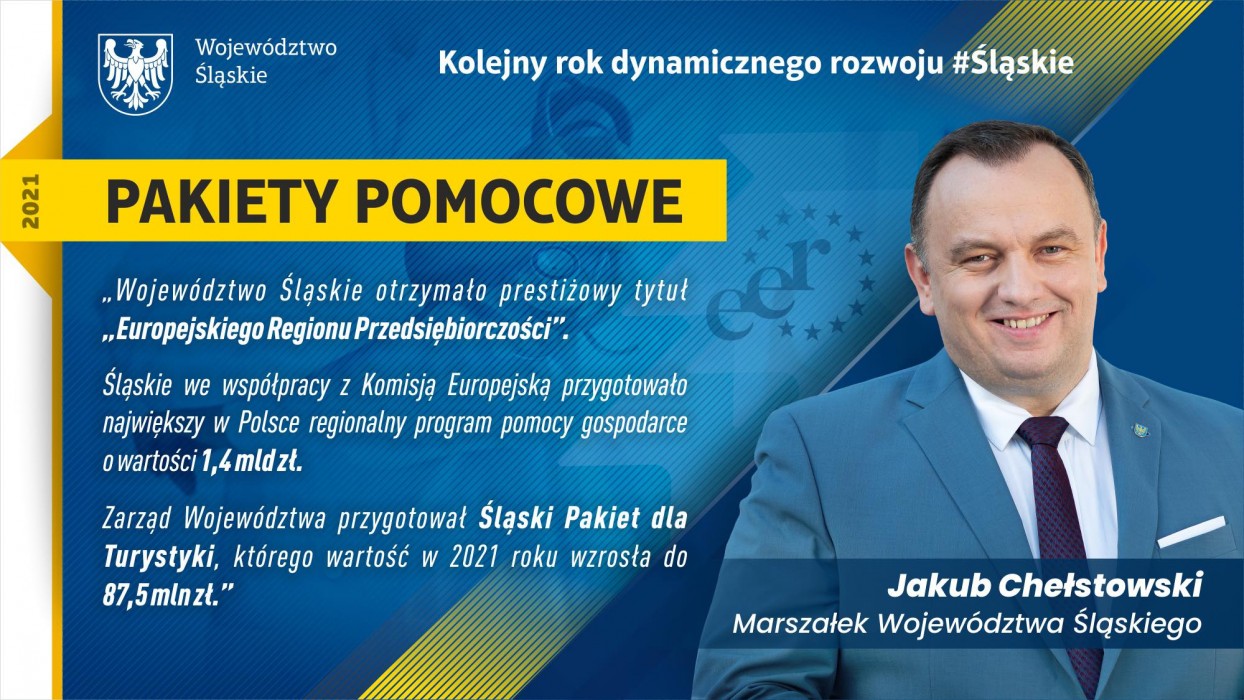 Na początku listopada kolejnych 14 podmiotów otrzymało wsparcie na blisko 15 mln zł w ramach Śląskiego Pakietu dla Gospodarki. Symboliczne czeki wręczono na Stadionie Śląskim. Sam program jest największą strategią wsparcia małych i średnich przedsiębiorstw w Polsce. Śląski Pakiet dla Gospodarki został uruchomiony wczesną wiosną 2020 roku, tuż po wybuchu pandemii. Dla przypomnienia, aż 1,4 miliarda złotych trafiło od tego czasu na pomoc firmom z Województwa Śląskiego dotkniętych skutkami koronawirusa. Pakiet wsparcia zainicjowany przez marszałka Jakuba Chełstowskiego jest uzupełnieniem Tarczy Antykryzysowej sygnowanej przez rząd Mateusza Morawieckiego. W realizację Pakietu zaangażowanych jest pięć instytucji: Fundusz Górnośląski, Wojewódzki Urząd Pracy, Śląskie Centrum Przedsiębiorczości, Departament Gospodarki i Współpracy Międzynarodowej Urzędu Marszałkowskiego oraz Śląski Fundusz Rozwoju. W ramach drugiego etapu zwiększono pulę o dodatkowe 367 mln zł. Maksymalna kwota dofinansowania ustalona została na poziomie 800 tys. zł. Wnioski o wsparcie w ramach Śląskiego Pakietu dla Gospodarki złożyło ponad 2,5 tysiąca firm. Województwo ruszyło na pomoc branży turystycznej, która również mocno ucierpiała wskutek pandemii COVID-19. Na ten cel zabezpieczono aż 87,5 mln zł. Od 30 kwietnia do 18 maja br przedsiębiorcy z regionu mogli składać wnioski w przeznaczonym dla branży turystycznej konkursie „Inwestycje w MŚP”, którego alokacja wynosi 76 mln złotych.