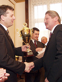 Dzisiaj wicemarszałek Województwa Śląskiego Jan Grela wręczył puchary w X edycji „Sportowego Turnieju Miast i Gmin 2004”.