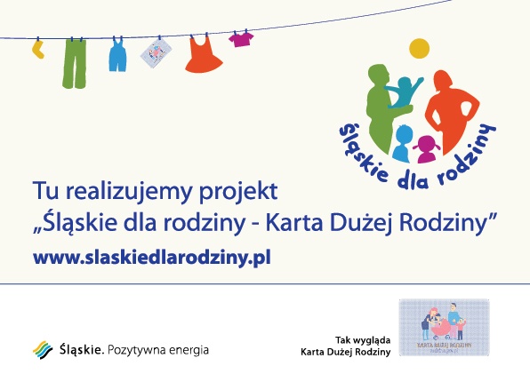 Tabliczka: Tu realizujemy projekt „Śląskie dla rodziny - Karta Dużej Rodziny”, w formacie A4, w ilości 250 sztuk.
