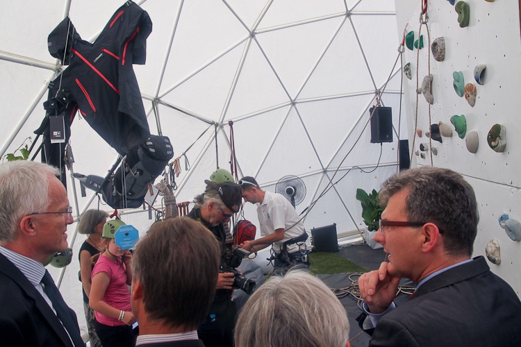 Wprost ze sceny marszałek oraz premier udali się na spacer po wszystkich pawilonach. Pawilon Beskidy, który odwiedzili jako pierwszy, wzbudził wiele emocji. Marszałek Śmigielski odbył niedługą, wirtualną przejażdżkę rowerową po trasach górskich. Potem na chwilę zatrzymano się w sektorze „Uzdrowiska/Spa", by przyjrzeć się wykonywanym tutaj zabiegom. Kolejnym namiotem był pawilon „Jura". Tutaj można było przyjrzeć się, jak zwolennicy wspinaczki górskiej zdobywają jurajską ściankę, podziwiano także ekspozycją sprzętu turystycznego autorstwa śląskich projektantów. W pawilonie „Industrial" goście zostali zaproszeni w wirtualną podróż windą górniczą do śląskich kopalni, leżących na Szlaku Zabytków Techniki. W pawilonie „Kino 3D" zwiedzający obejrzeli prezentację na temat śląskiej turystyki, przygotowaną specjalnie na wydarzenia „Guck mal! Schlesien". W namiocie głównym zatrzymano się na dłużej. Tutaj można było odpocząć i zakosztować specjałów śląskiej kuchni. Atmosfera rozmów, prowadzonych w otoczeniu śląskiego designu, odpowiednio dobranej muzyki oraz prezentacji multimedialnych na temat regionu, musiała przypaść gościom do gustu, ponieważ w tym pawilonie spędzili najwięcej czasu.