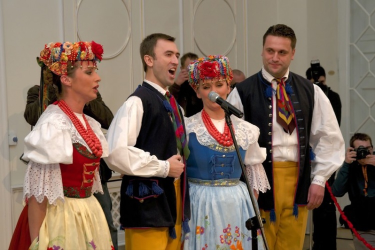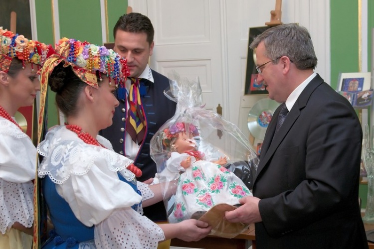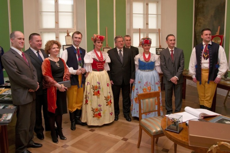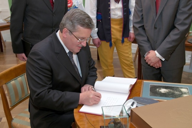 Bronisław Komorowski zwiedził ekspozycję prezentującą historię i dorobek Zespołu oraz wpisał się w księdze pamiątkowej. Wysłuchał także występu artystów "Śląska".