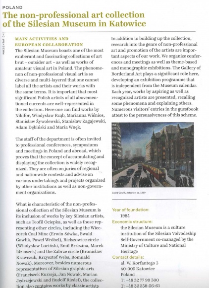 „On the map. Exploring European Outsider Art" jest przewodnikiem po 60 europejskich instytucjach i organizacjach w 26 krajach. W publikacji, ukazującej nie tylko galerie prezentujące prace twórców naiwnych, lecz także miejsca, gdzie sztuka nieprofesjonalna jest tworzona, znalazły się takie instytucje jak Art&marges Museum, Lille Metropole Musee, Museum Samlmlung Prinzhorn czy Museum Haus der Kunsler Gugging. W tym gronie została również opisana kolekcja plastyki nieprofesjonalnej Muzeum Śląskiego, którą na co dzień możemy oglądać dzięki licznym wystawom Galerii Sztuki Pogranicza.