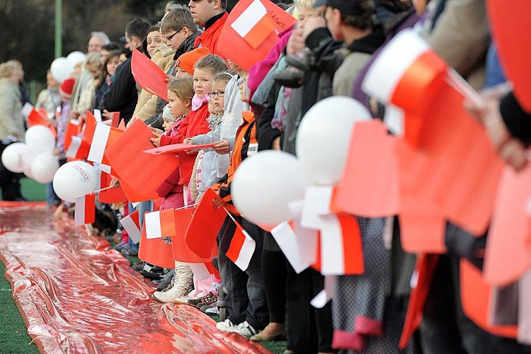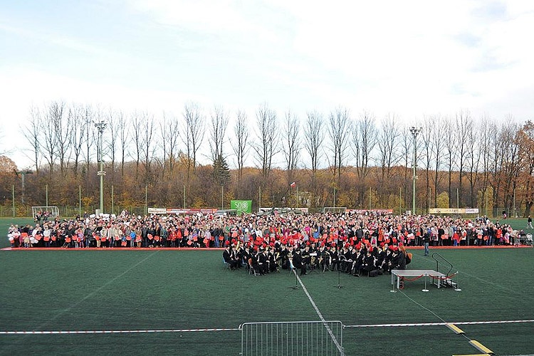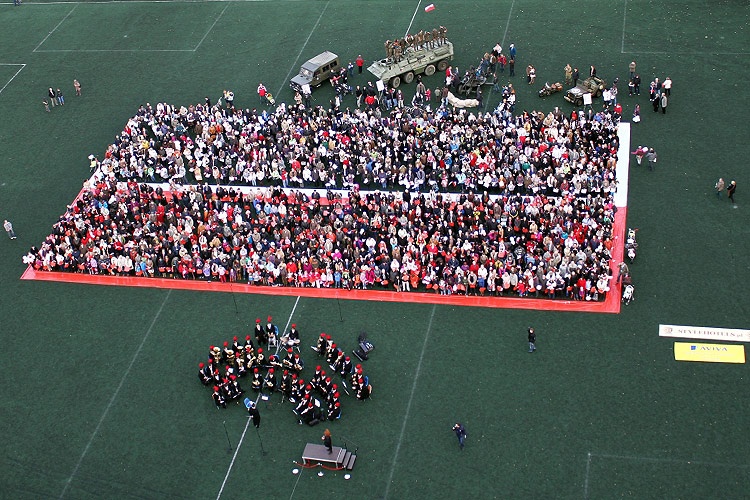 Punktem kulminacyjnym imprezy było odśpiewanie, punktualnie o godz. 15.00 przez blisko 2 tysiące osób, Mazurka Dąbrowskiego przy akompaniamencie Górniczej Orkiestry Dętej „Piekary-Julian". Podczas hymnu wspierała wszystkich śpiewaczka Alina Trefon. Następnie na środku boiska utworzono „żywą" biało-czerwoną flagę. Dla upamiętnienia tych chwil zostały zrobione zdjęcia z kilkudziesięciometrowej wysokości. Będą z pewnością świetną pamiątką dla uczestników imprezy.