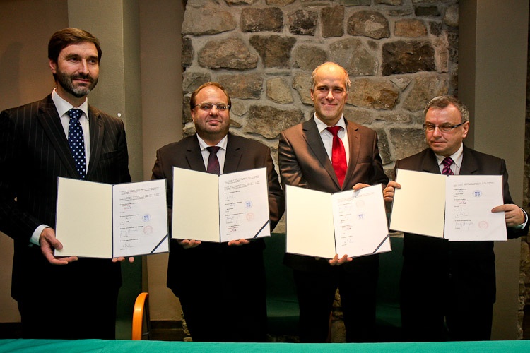 Uroczystość podpisania aktu założycielskiego Europejskiego Ugrupowania Współpracy Tery-torialnej TRITIA odbyła się na Zamku w Cieszynie. Obok przedstawicieli strony polskiej, Marszałka Województwa Śląskiego Adama Matusiewicza i Opolskiego, Józefa Sebesty dokument parafowali - hetman Kraju Morawsko-Śląskiego Miroslav Novak oraz Juraj Blanár przewodniczący Samorządowego Kraju Żylińskiego.