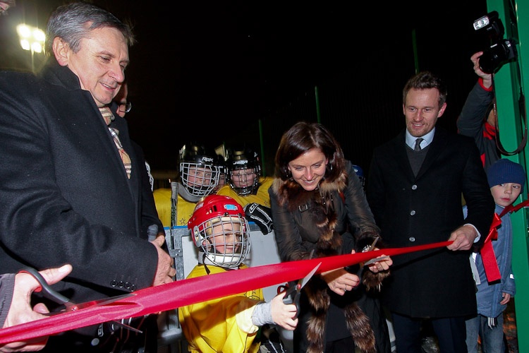 „Boisko-Lodowisko" oficjalnie otworzyła Minister Sportu i Turystyki Joanna Mucha w towarzystwie rektora uczelni prof. Adama Zająca oraz ... najmłodszego z trenujących hokeistów