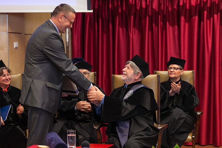„Człowiek wzbudzający głęboki szacunek, uznanie i sympatię. Nie bojąc się podejmować drażliwych kwestii, zawsze podkreślał, że różnice między ludźmi wynikają z cech charakteru i nie mają nic wspólnego ani z kolorem skóry, ani z narodowością. Konsekwentny w obronie dobrego imienia i spraw swojego narodu, ale jednocześnie potrafiący odciąć się od stereotypów i uprzedzeń, w każdym człowieku zawsze stara się szukać dobra. Taka postawa zjednuje Mu powszechną przychylność ludzi. W uroczystym dniu nadania tytułu doktora honoris causa patrzymy jednak na Niego przede wszystkim jako na pracownika naukowego. To Jego działalność naukowa, obok niekwestionowanych zasług na niwie politycznej, w dziedzinie zbliżania obu naszych narodów, w dużej mierze zadecydowała o chęci nadania Mu tego zaszczytnego tytułu" - mówiła o odznaczonym w uroczystej laudacji prof. Urszula Zagóra-Jonszta.