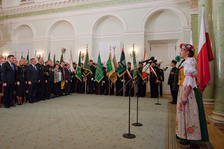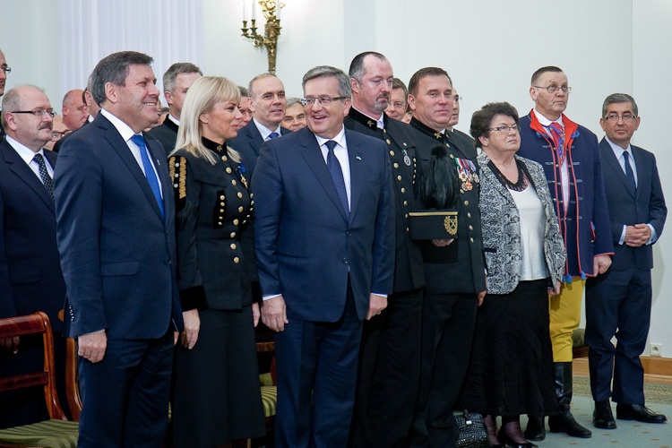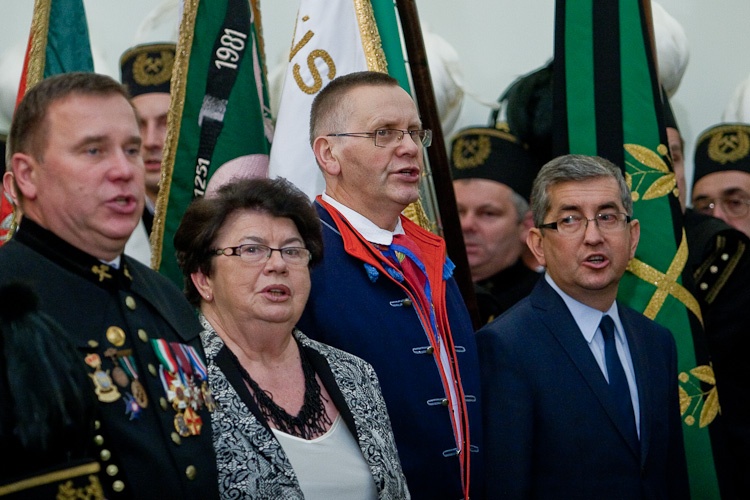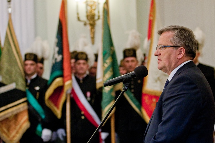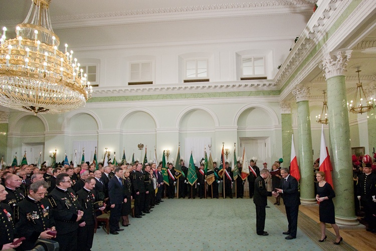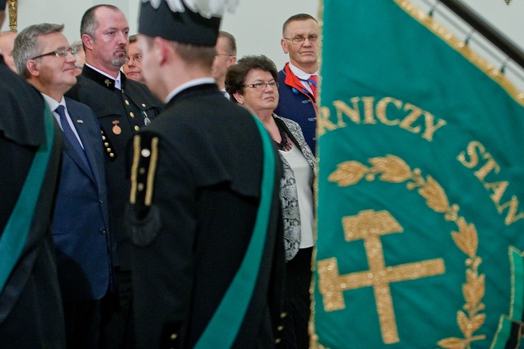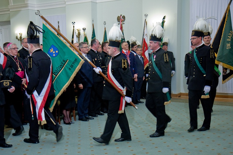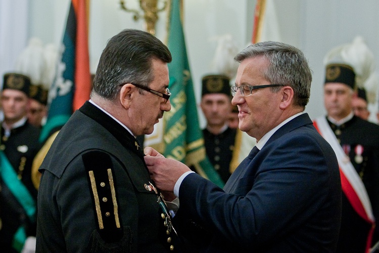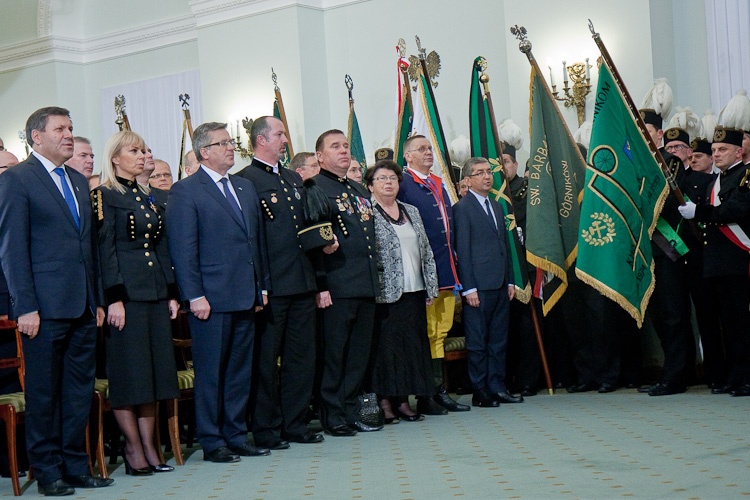 "Jest mi niesłychanie miło, że mogę dziś w Pałacu Prezydenckim gościć górniczy stan, że mogę wyróżnić, podziękować w imieniu całej Polski za trud górniczy, za efekty pracy górników, za cechy charakteru, które najlepiej widać, gdy trzeba prowadzić trudne akcje ratownicze" - powiedział Prezydent RP Bronisław Komorowski wręczając z okazji Dnia Górnika odznaczenia państwowe. Dziękował w imieniu całej Polski za trud górniczy, za efekty pracy górników, za cechy charakteru. "Dziękując, w sposób szczególny myślę o Śląsku, który zawsze będzie się kojarzył z najtrudniejszą, czasem najbardziej ryzykowną, ale też najbardziej zakorzenioną w tradycjach pracą górniczą. Cieszę się i dziękuję, że możemy dzisiaj w Warszawie pokazać, że jest tego Śląska trochę więcej, że Śląsk jest ważny nie tylko dla Śląska, ale dla całej Polski"- dodał. Prezydent zwrócił uwagę, że specyfiką Śląska jest szczególny stosunek do pracy, do poczucia odpowiedzialności za drugiego, za kolegę w pracy, szczególny stosunek do tradycji, do wiary przodków, do języka, przywiązanie do rodziny. "Chciałbym bardzo, aby te cechy - pracowitość, pragmatyzm, praktyczność w podejściu do życia wydobyć i pokazać całej Polsce w jak najlepszym świetle" - powiedział.