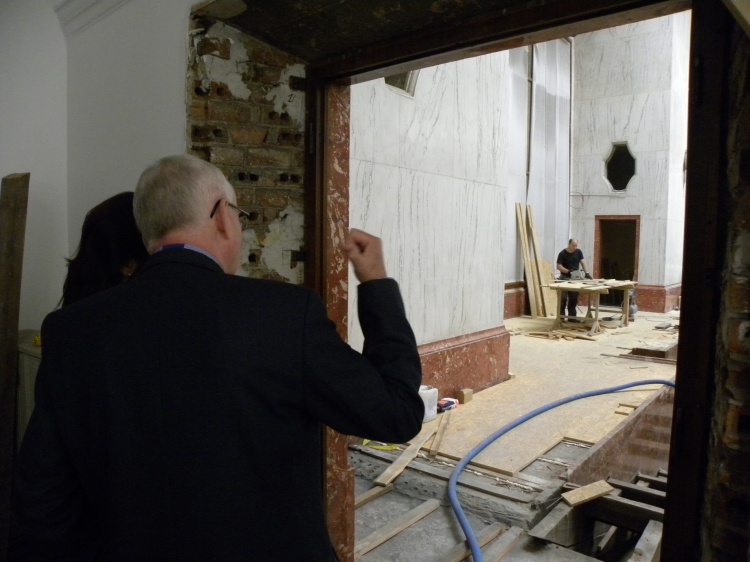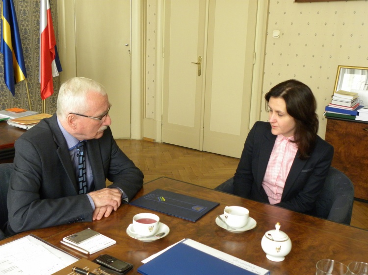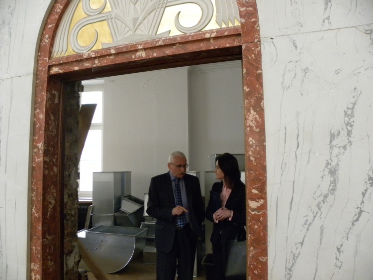 Przewodniczący A. Gościniak przedstawił A. Knast zasady polityki historycznej realizowanej przez Sejmik IV kadencji. Kolejnym tematem były zagadnienia związane z trwającą rewaloryzacją historycznej Sali Sejmu Śląskiego, w której pracuje obecnie samorząd województwa. Jest to pierwszy kompleksowy remont obiektu od 85 lat. Marszalkowi, Wojewodzie i Sejmikowi zależy na przywróceniu mu historycznej świetności oraz dostosowaniu do współczesnych potrzeb. Andrzej Gościniak zapoznał Panią Dyrektor ze stanem prac w Sali Sejmu.