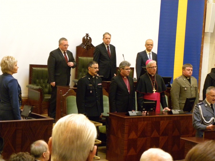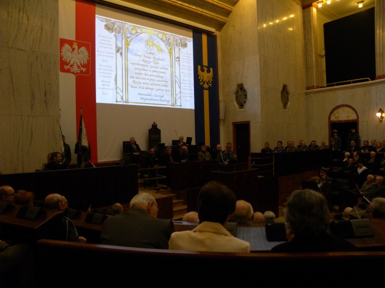 W Sali Sejmu Śląskiego licznie reprezentowani byli członkowie wojewódzkich służb mundurowych. Życzenia świąteczne złożył zebranym Marszałek Województwa Wojciech Saługa.