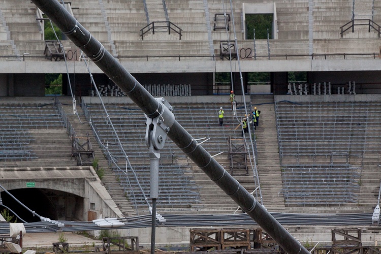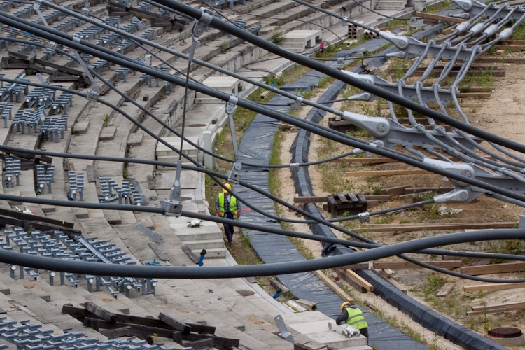 Warto przypomnieć - konstrukcja linowa zadaszenia składa się z 40 lin promieniowych górnych i 40 lin promieniowych dolnych, 320 lin wieszaków, łączących górne i dolne liny, 40 stalowych łączników i 8 lin tworzących pierścień wewnętrzny rozciągany.