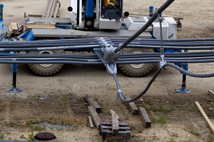 W drugim dniu operacji uniesiono większą część lin obwodowych do wysokości ok. 1,5 m nad ziemią. Do soboty będą zamontowane wieszaki łączące liny nośne i napinające.