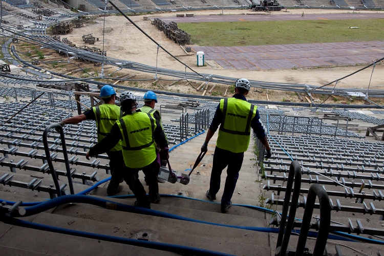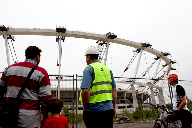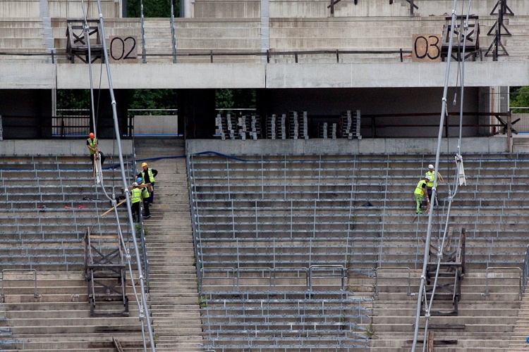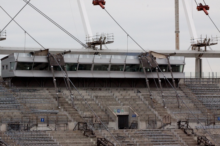 Ta niezwykle skomplikowana operacja trwa nieprzerwanie od czwartku. Podnoszona jest konstrukcja linowa dachu licząca łącznie ok. 11 km długości. Polega to na jednoczesnym podciągnięciu każdej z 40 lin napinających wiązary radialne przy pomocy siłowników, wpięciu do pierścieni ściskanych stadionu na poziomie ok. 50 m oraz lin nośnych na poziomie ok. 30 m.