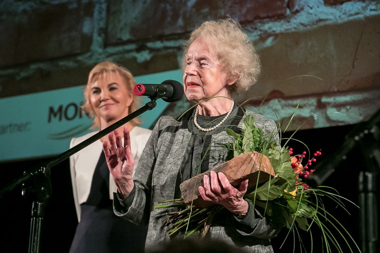 Prawdziwą cegłę pochodzącą z wyburzonego zabrzańskiego familoka, w którym urodził się Janosch, wręczyła laureatce wicemarszałek Aleksandra Skowronek.