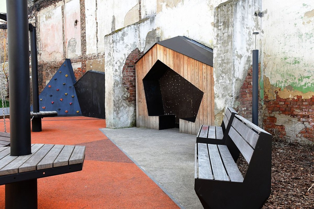 Najmłodszym służą m.in. miniścianka wspinaczkowa, nieduży park linowy, huśtawki, piaskownica, ale też galeria krzywych luster. Starsi wypocząć mogą na leżakach lub wprost na trawie. Roślinność uzupełniono o karmniki dla ptaków i „hotele” dla owadów. Symboliczną bramę zbudowano z dwuteowników, nawiązując w ten sposób do industrialnego dziedzictwa miasta.