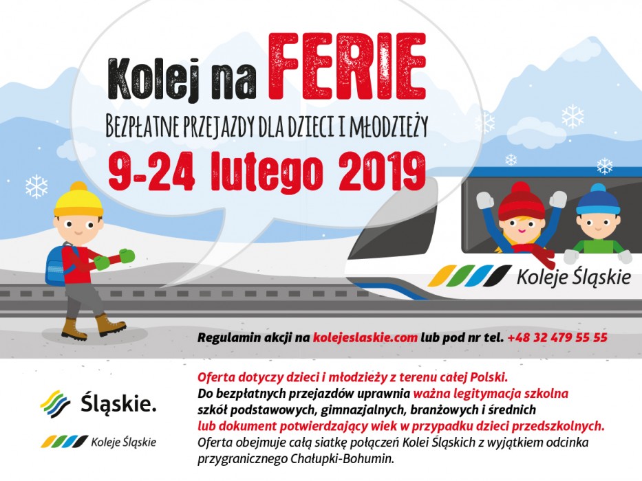 Warto pamiętać, że Koleje Śląskie przygotowały z tej okazji specjalną akcję „Kolej na ferie!”. Od 9 do 24 lutego uczniowie szkół podstawowych, gimnazjalnych, licealnych, techników i szkół branżowych mogą podróżować pociągiem za darmo, po okazaniu legitymacji szkolnej. Z bezpłatnych przejazdów mogą skorzystać również najmłodsi – w tym wypadku wystarczy dokument potwierdzający wiek. Promocja obejmuje swoim zasięgiem wszystkie linie obsługiwane przez Koleje Śląskie – jedynym wyjątkiem będzie odcinek przygraniczny Chałupki – Bohumin. Oznacza to, że uczestnicy akcji będą mogli wybrać się pociągiem nie tylko do Ustronia, Wisły czy Zwardonia, ale również do Zakopanego.
