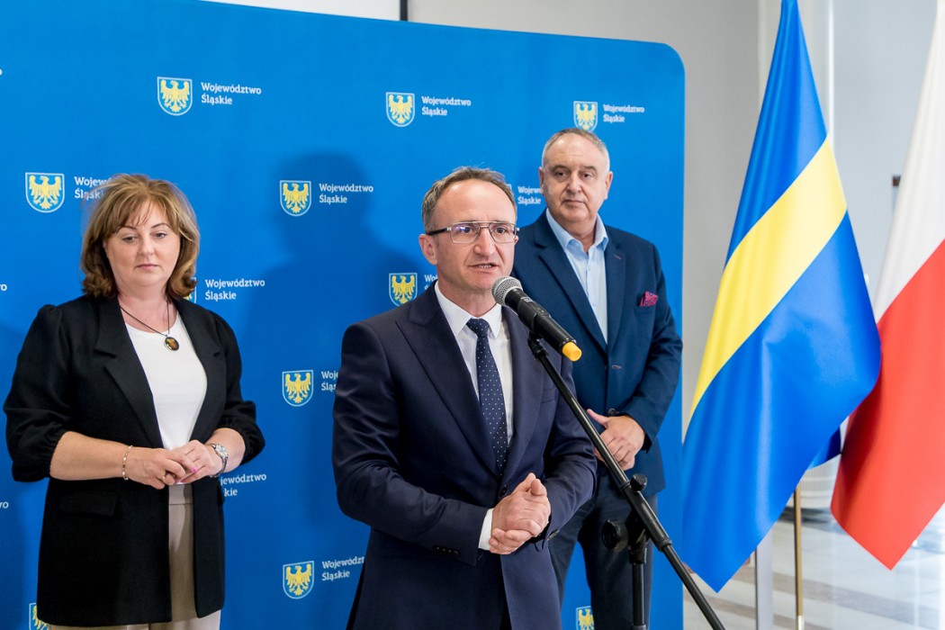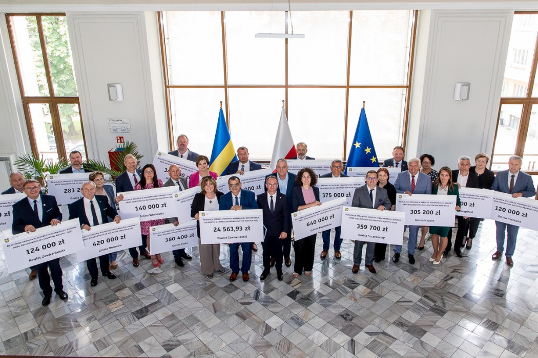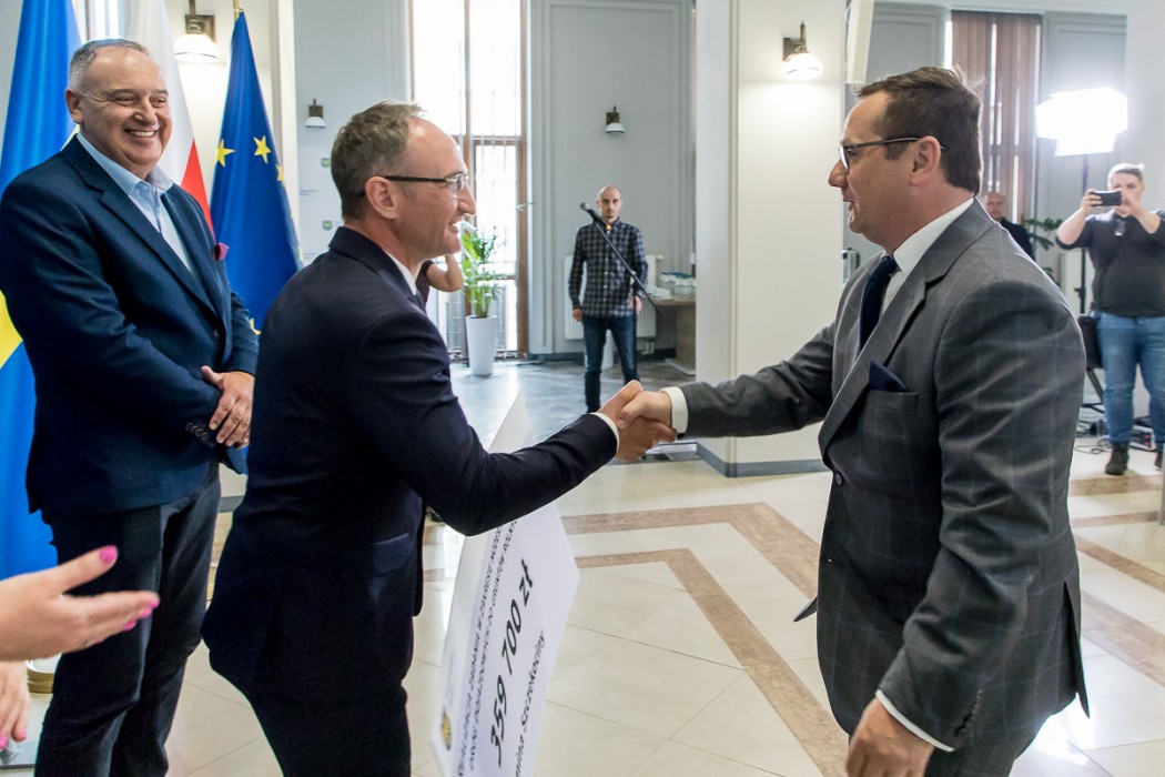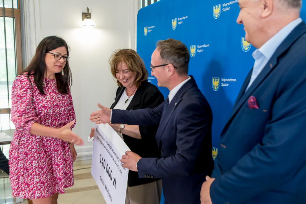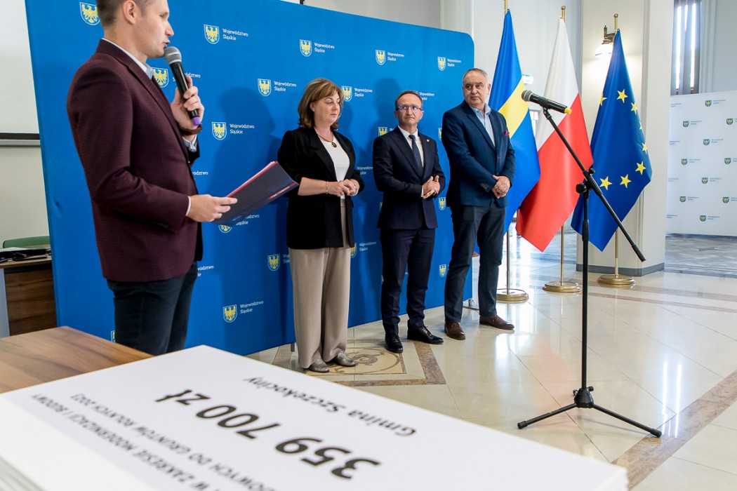 Przedstawiciele samorządów odebrali symboliczne czeki z rąk Grzegorza Boskiego, członka Zarządu Województwa Śląskiego. W wydarzeniu uczestniczyli także radni Sejmiku – Maria Materla i Marek Bieniek.