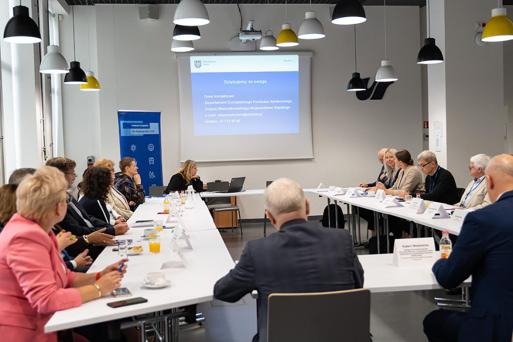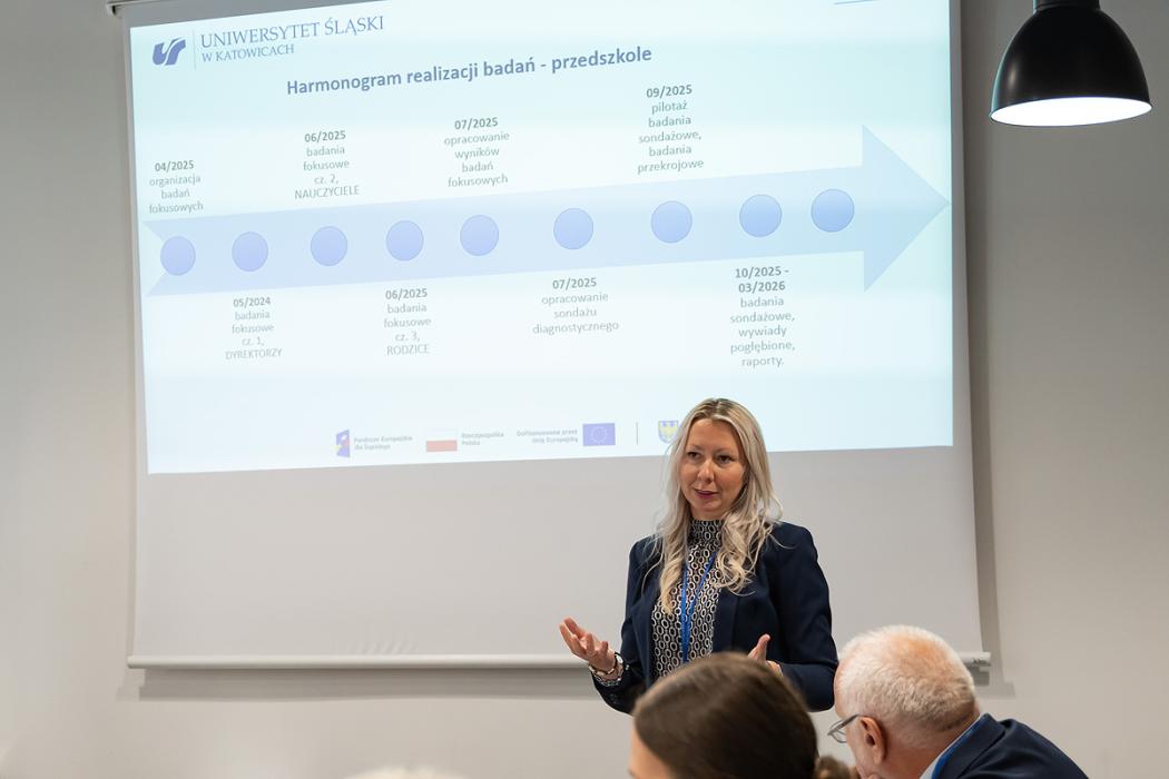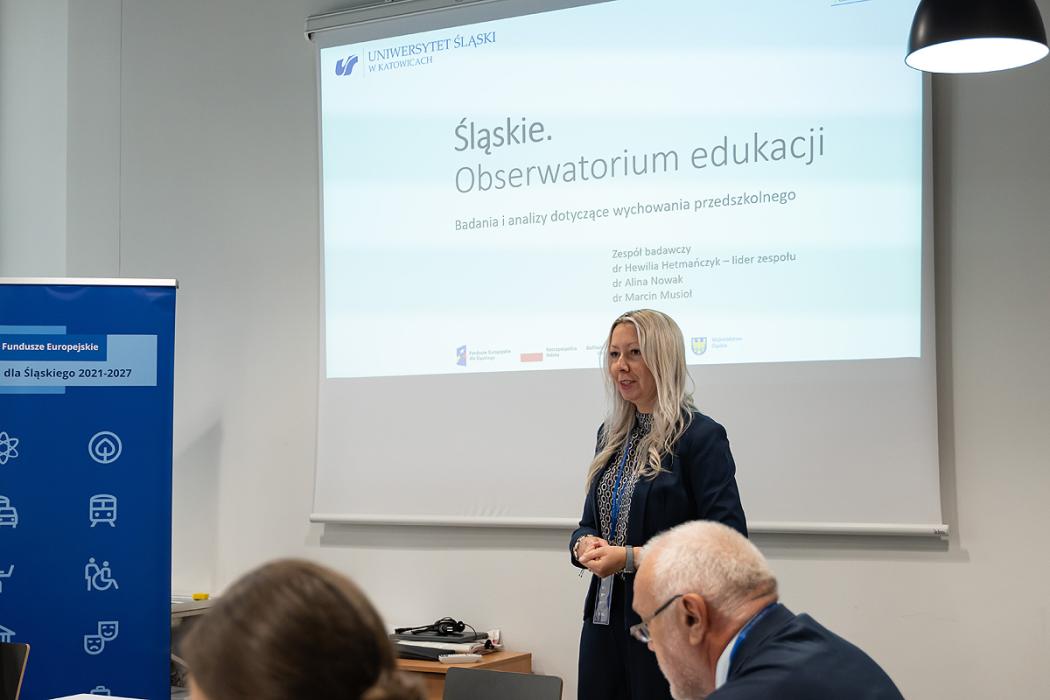 Podczas posiedzenia przedstawiciele Uniwersytetu Śląskiego, dr Hewilia Hetmańczyk, dr Alina Nowak i dr Marcin Musioł – zaprezentowali wyniki badań focusowych dotyczących wychowania przedszkolnego. Celem badań UŚ było zidentyfikowanie problemów i potrzeb wśród dyrektorów, nauczycieli oraz rodziców dzieci w wieku przedszkolnym. Analizy objęły takie obszary jak: nowoczesne metody nauczania, kompetencje cyfrowe, predykcję zawodów przyszłości oraz wpływ zmian demograficznych na edukację przedszkolną.