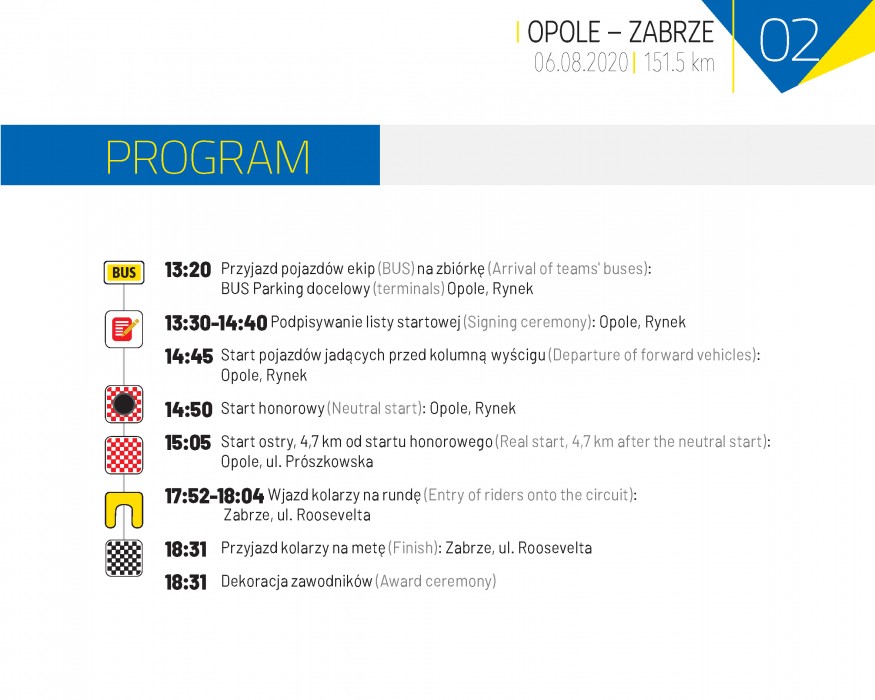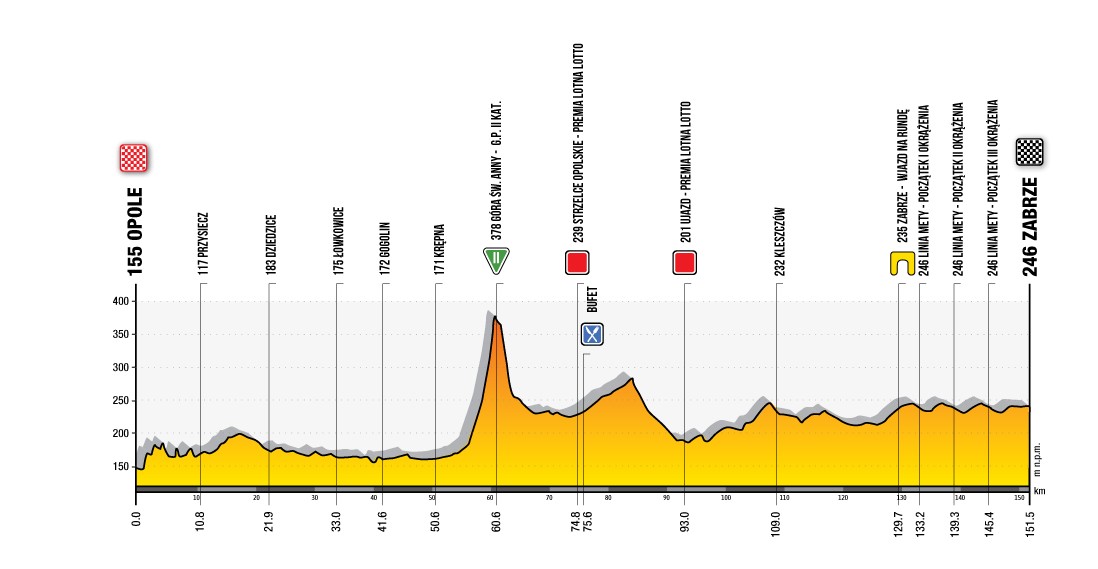 Drugi etap to szybki, ale trudny technicznie odcinek z Opola do Zabrza, na którym o zwycięstwo powinni walczyć sprinterzy. Na trasie znajduje się jeden bardzo wymagający podjazd – Góra Świętej Anny, gdzie znajduje się Premia Górska PZU II kategorii. Następnie kolarze powalczą na dwóch Lotnych Premiach LOTTO – Strzelce Opolskie oraz Ujazd i zawitają do Zabrza. Tam będą mieli do pokonania trzy rundy po sześć kilometrów, a finisz znajduje się tradycyjnie przy Arenie Zabrze.