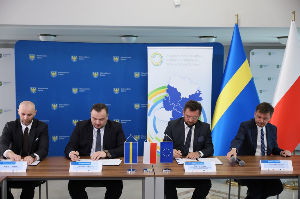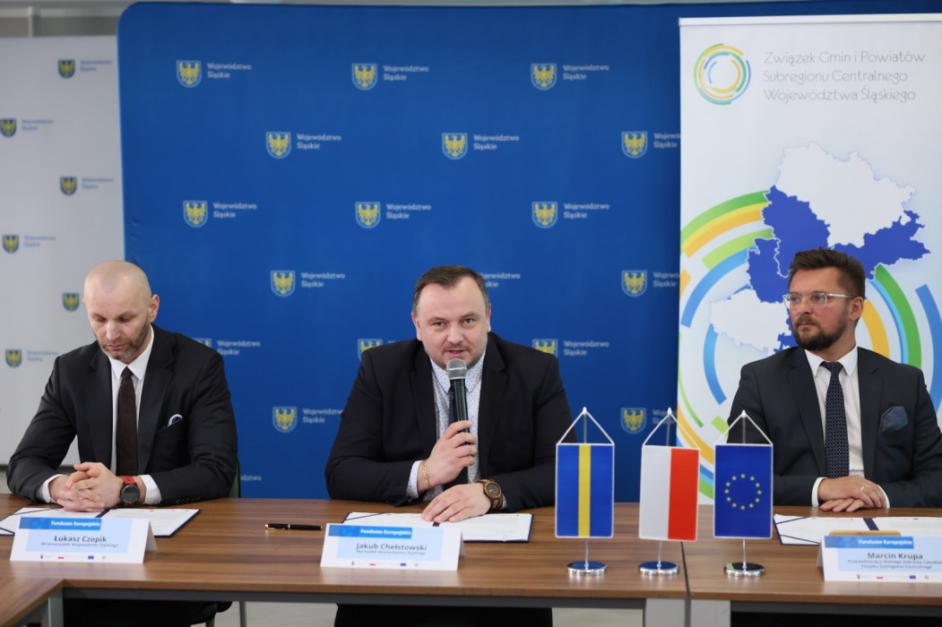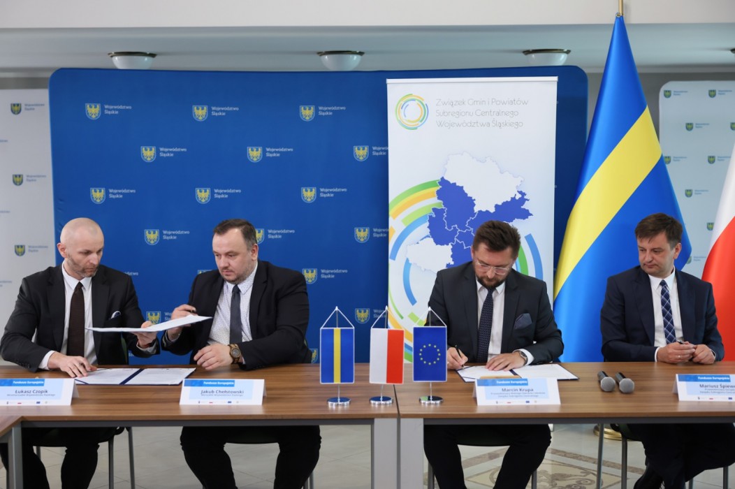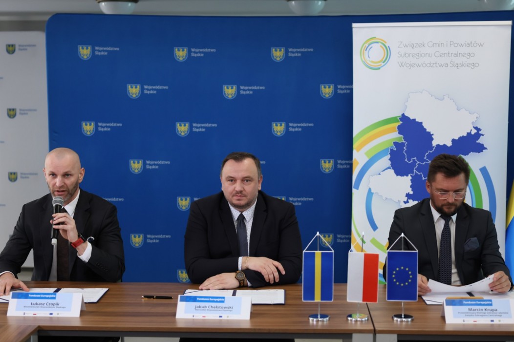 W Sali Kolumnowej Urzędu Marszałkowskiego podpisano porozumienia przygotowania i realizacji instrumentu Zintegrowane Inwestycje Terytorialne w ramach Programu Fundusze Europejskie dla Śląskiego 2021-2027 pomiędzy zarządem Województwa Śląskiego a Związkiem Gmin i Powiatów Subregionu Centralnego. Podpisy pod dokumentem złożyli: marszałek województwa Jakub Chełstowski, wicemarszałek Łukasz Czopik, prezydent Katowic Marcin Krupa i wiceprezydent Gliwic Mariusz Śpiewok.
