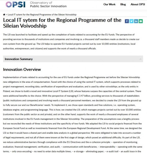 Już na etapie przygotowywania Regionalnego Programu Operacyjnego Województwa Śląskiego 2014-2020, mając w perspektywie zarządzanie kwotą 3,47 mld euro, obsługę tysięcy interesariuszy (instytucji publicznych i firm) oraz zaangażowanie blisko tysiąca osób personelu podjęto decyzję o stworzeniu od podstaw LSI, dostosowanego do specyfiki i potrzeb zarówno urzędu, jak i beneficjentów. W przyjętym rozwiązaniu postawiono na otwarte standardy i darmowe rozwiązania, tj. system operacyjny, silnik bazy danych i język oprogramowania. Powstał system, który z jednej strony obsługuje projekty realizowane przez ponad 10 000 podmiotów (klientów z sektora zarówno publicznego, jak i prywatnego), a z drugiej strony jest wsparciem w pracy blisko tysiąca pracowników kilku instytucji zaangażowanych w zarządzanie środkami unijnymi w województwie śląskim.