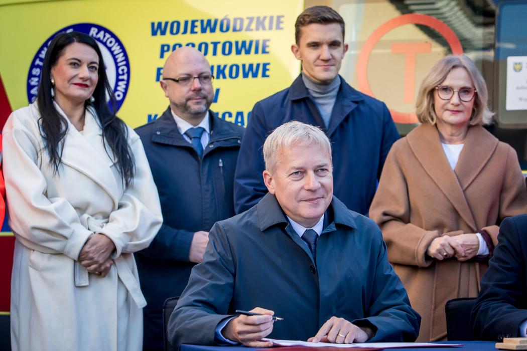W uroczystym podpisaniu umowy na pozyskanie pojazdów ze środków pochodzących z Rządowego Programu Ochrony Ludności i Obrony Cywilnej uczestniczyli marszałek Wojciech Saługa, wojewoda śląski Marek Wójcik, posłowie na Sejm RP Urszula Koszutska i Mateusz Bochenek oraz radni Sejmiku Województwa Śląskiego - Adam Lubas i Aldona Węgrzynowicz.