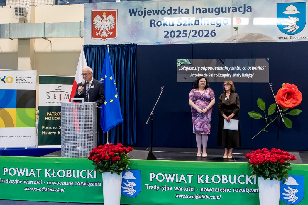 - To ważny dzień w historii powiatu, bo wojewódzka inauguracja roku szkolnego właśnie w zespole szkół w Kłobucku odbywa się po raz pierwszy. Ale też trzeba zaznaczyć, że jest to miejsce na edukacyjnej mapie regionu szczególne, mocno stawiające na nowoczesne technologie, a żyjemy w czasach, gdzie z postępem technologicznym musimy być na bieżąco, bo właśnie tego wymaga od nas wszystkich, a zwłaszcza od młodych ludzi, rynek pracy. Ta szkoła kreując nowe zawody, wychodzi naprzeciw nowoczesnej gospodarce. Podstawą są warsztaty, które ugruntowują wiedzę w praktyce. Przedsiębiorca zatrudniający absolwenta, dosłownie, stawiając go za maszyną wartą pół miliona, czy nawet milion złotych może mu zaufać. Mieć pewność, że powierzone młodemu pracownikowi zadanie zostanie wykonane fachowo i precyzyjnie, zgodnie z aktualną technologią. Szkoła pełni dziś bardzo ważną rolę dla tej części regionu. Dostarcza fachowców lokalnym firmom. Szkoły o konkretnym zawodowym profilu pełnią więc bardzo ważną rolę w łańcuchu gospodarki. Cieszę się, że przeżywają swój renesans – zaakcentował Henryk Kiepura, sekretarz stanu w Ministerstwie Edukacji, który inaugurację objął honorowym patronatem.