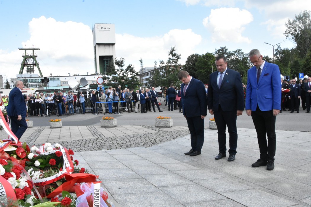 Na zakończenie uroczystości delegacje złożyły kwiaty pod pomnikiem Porozumienia Jastrzębskiego. W imieniu władz województwa wiązankę złożyli marszałek Jakub Chełstowski i wicemarszałek Wojciech Kałuża.