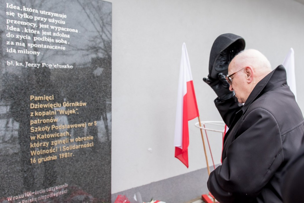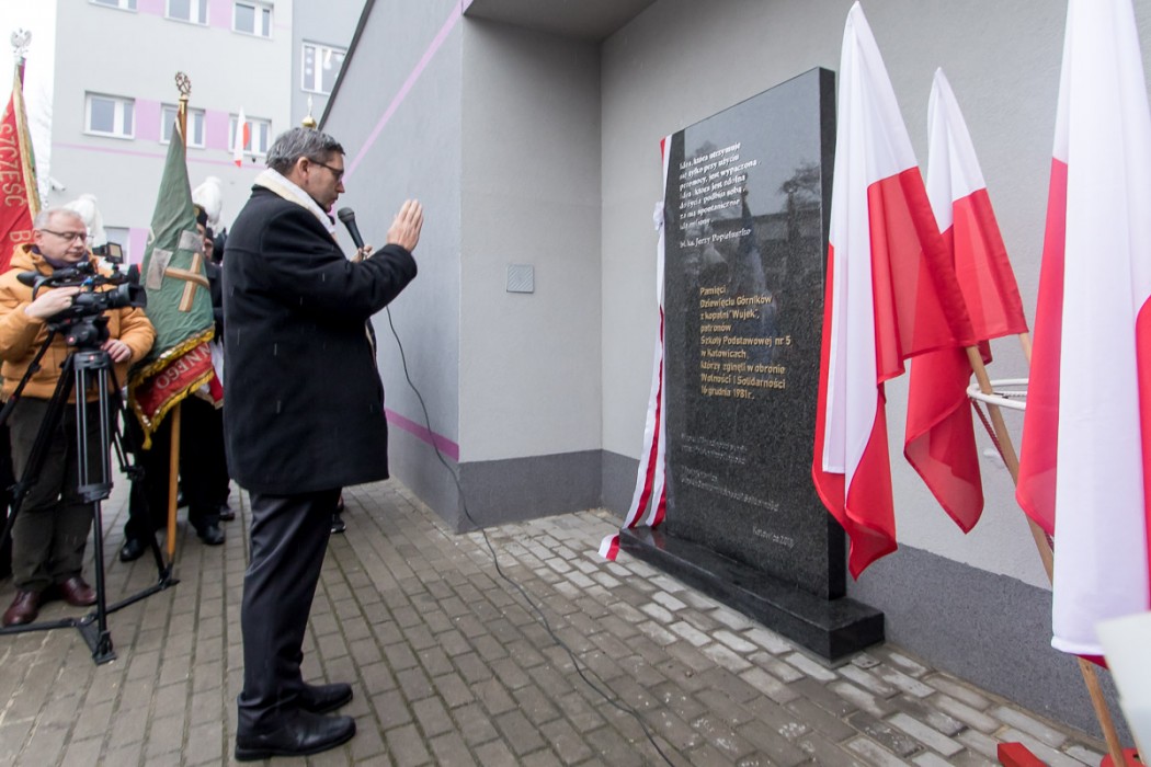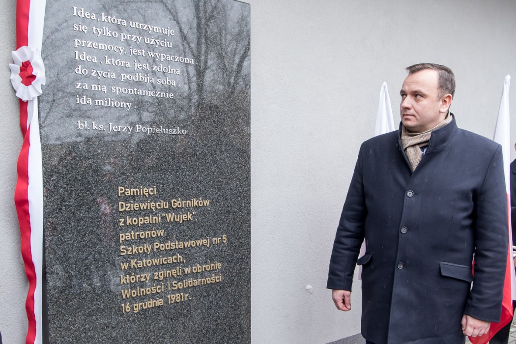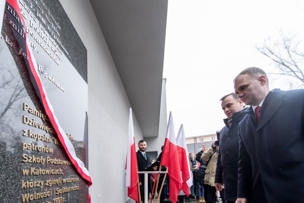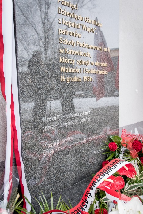 Pamiątkowa tablica znajduje się przed budynkiem Szkoły Podstawowej nr 5 w Katowicach, która nosi imię Dziewięciu Górników z Wujka. W uroczystym odsłonięciu tablicy brali udział także uczestnicy wydarzeń sprzed 37 lat, m.in. ówczesny przewodniczący Komisji Zakładowej NSZZ „Solidarność” w Kopalni Wujek Jan Ludwiczak oraz Stanisław Płatek, jeden z przywódców strajku w kopalni. Warto przypomnieć, że do krwawej pacyfikacji Kopalni Wujek doszło 16 grudnia 1981 roku. Życie straciło wówczas 9 górników, a 23 zostało rannych. Wśród zamordowanych górników znaleźli się: Józef Czekalski, Józef Giza, Joachim Gnida, Ryszard Gzik, Bogusław Kopczak, Andrzej Pełka, Jan Stawisiński, Zbigniew Wilk i Zenon Zając.