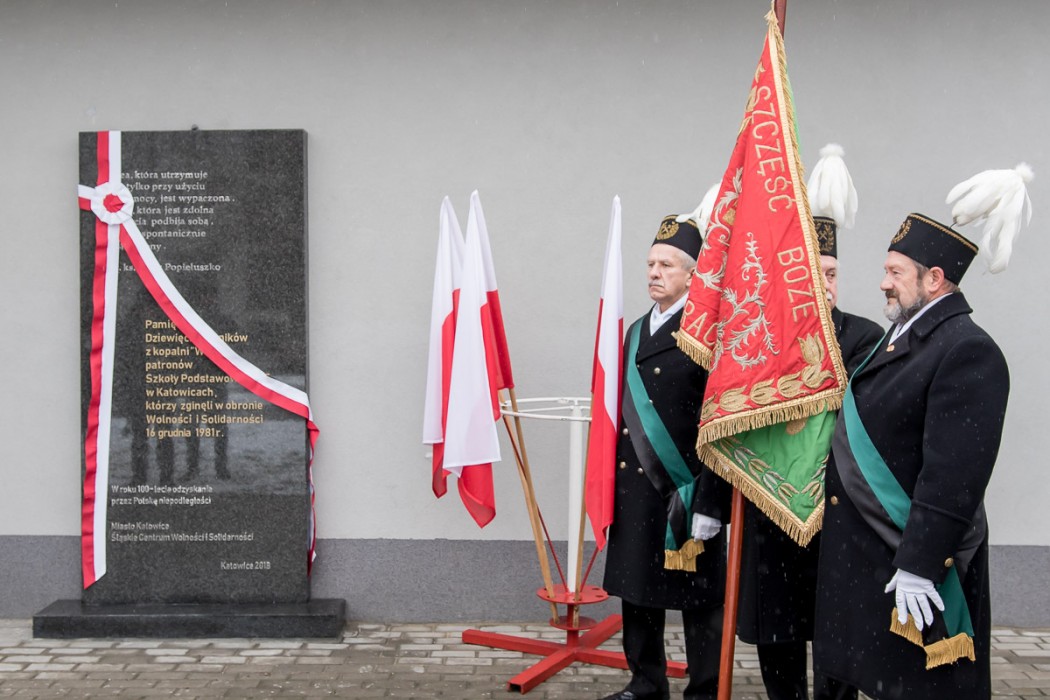 Pamiątkowa tablica znajduje się przed budynkiem Szkoły Podstawowej nr 5 w Katowicach, która nosi imię Dziewięciu Górników z Wujka. W uroczystym odsłonięciu tablicy brali udział także uczestnicy wydarzeń sprzed 37 lat, m.in. ówczesny przewodniczący Komisji Zakładowej NSZZ „Solidarność” w Kopalni Wujek Jan Ludwiczak oraz Stanisław Płatek, jeden z przywódców strajku w kopalni. Warto przypomnieć, że do krwawej pacyfikacji Kopalni Wujek doszło 16 grudnia 1981 roku. Życie straciło wówczas 9 górników, a 23 zostało rannych. Wśród zamordowanych górników znaleźli się: Józef Czekalski, Józef Giza, Joachim Gnida, Ryszard Gzik, Bogusław Kopczak, Andrzej Pełka, Jan Stawisiński, Zbigniew Wilk i Zenon Zając.